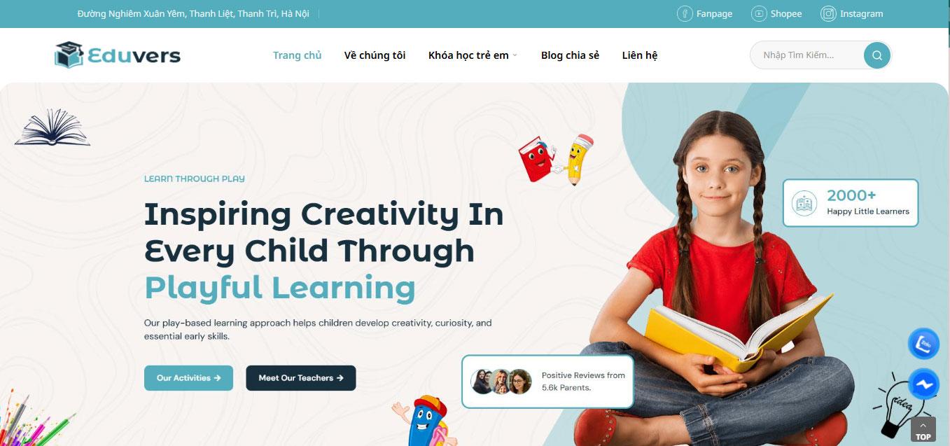 Trang chủ khởi đầu với khu vực header tinh tế gồm logo thương hiệu Eduvers, hệ thống menu điều hướng khoa học và công cụ tìm kiếm khóa học tiện lợi. Ngay bên dưới là banner chính (Hero Section) đầy thu hút với slogan "Inspiring Creativity In Every Child Through Playful Learning", đi kèm hình ảnh bé gái đang say mê đọc sách, khẳng định triết lý lấy trẻ làm trung tâm của học viện.