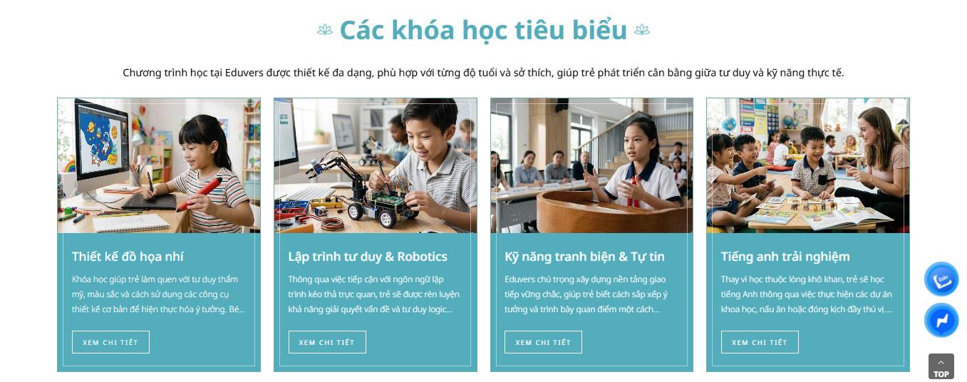 Khu vực Các khóa học tiêu biểu được trình bày dưới dạng các thẻ nội dung sinh động, bao gồm từ lập trình robot, hội họa đến các lớp kỹ năng mềm, giúp phụ huynh dễ dàng tìm thấy lộ trình phát triển phù hợp cho con mình. Điểm nhấn đặc biệt là phần mô tả giá trị giáo dục, nhấn mạnh vào việc kích thích sức sáng tạo và tư duy độc lập thông qua hình ảnh minh họa thực tế sinh động.