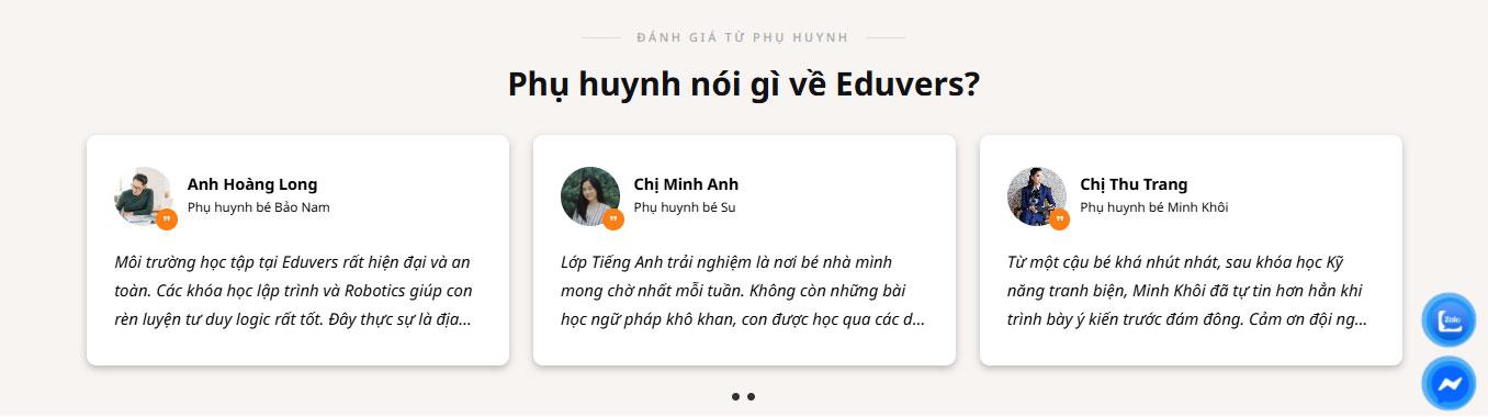 Website tích hợp khu vực Giải đáp thắc mắc (FAQ) với thiết kế thông minh, giúp phụ huynh nhanh chóng tìm hiểu về chương trình học và học phí. Bên cạnh đó, phần Đội ngũ giáo viên giới thiệu những người truyền cảm hứng có trình độ chuyên môn cao, tạo sự an tâm về chất lượng giảng dạy. Khu vực Phụ huynh nói gì về Eduvers? (Testimonials) mang đến những phản hồi chân thực nhất, tăng tính thuyết phục cho thương hiệu.